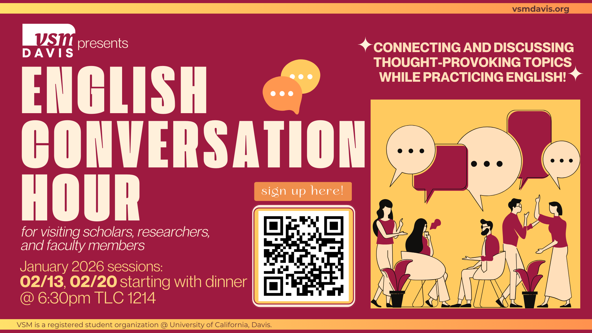 VSM is a registered campus group at UC Davis seeking to serve visiting faculty members, researchers, post-docs, and graduate students to acquaint them with the UCD campus and community. To that end, we provide campus tours, English conversation groups, shopping trips to Target and Walmart, weekend outings, and friendship over home-cooked meals.